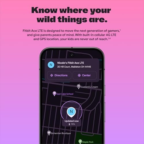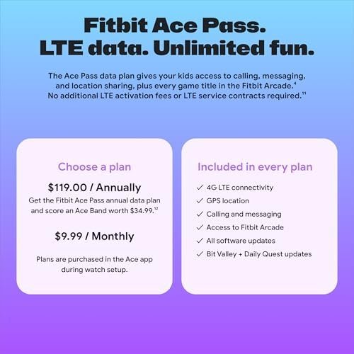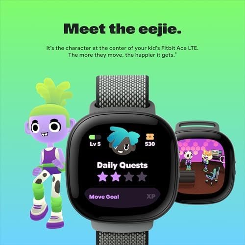 About this item KNOW WHERE YOUR WILD THINGS ARE – The Fitbit Ace LTE is the first-of-its-kind kids smartwatch and fitness tracker designed to move the next generation of gamers; with built-in cellular 4G LTE and GPS location, they’re never out of reach[1,4] IN-APP CALLS & MESSAGES WITHOUT A PHONE NUMBER – Stay connected and add up to 20 contacts (ages 13 and up) for them to call and message with; Works with most Android 11.0 or newer or iOS 16 or newer[20,21,22]; Google account and Fitbit Ace app required. A BATTERY THAT KEEPS ON GOING – With 16+ hours of battery life, Fitbit Ace LTE can keep up with kids all day long[15]; and fast charging provides 11 hours of battery life in just 30 minutes[16] LTE DATA FOR UNLIMITED FUN – The Fitbit Ace Pass data plan gives you access to calling, messaging, and location sharing; plus, kids get every game title in the Fitbit Arcade[4,7] HELP YOUR KIDS FOCUS AT SCHOOL – School Time lets you limit gameplay on your kid’s watch during the day to help them focus, while still letting them getting in touch if they need to; kids cannot message each other using Fitbit Ace LTE[8] KEEP KIDS ACTIVE – The Fitbit Arcade is full of movement-based games for fun at every level[9]; and the Noodle is an activity ring that records steps, jumps, and bounces and celebrates with a fun animation when kids reach their Move Goal[3] UNLOCK MORE FUN STUFF – Every Fitbit Ace LTE Band has technology that unlocks a new haul; kids can keep the eejie’s house looking fresh and stay active with a new Noodle and activity challenges[10]