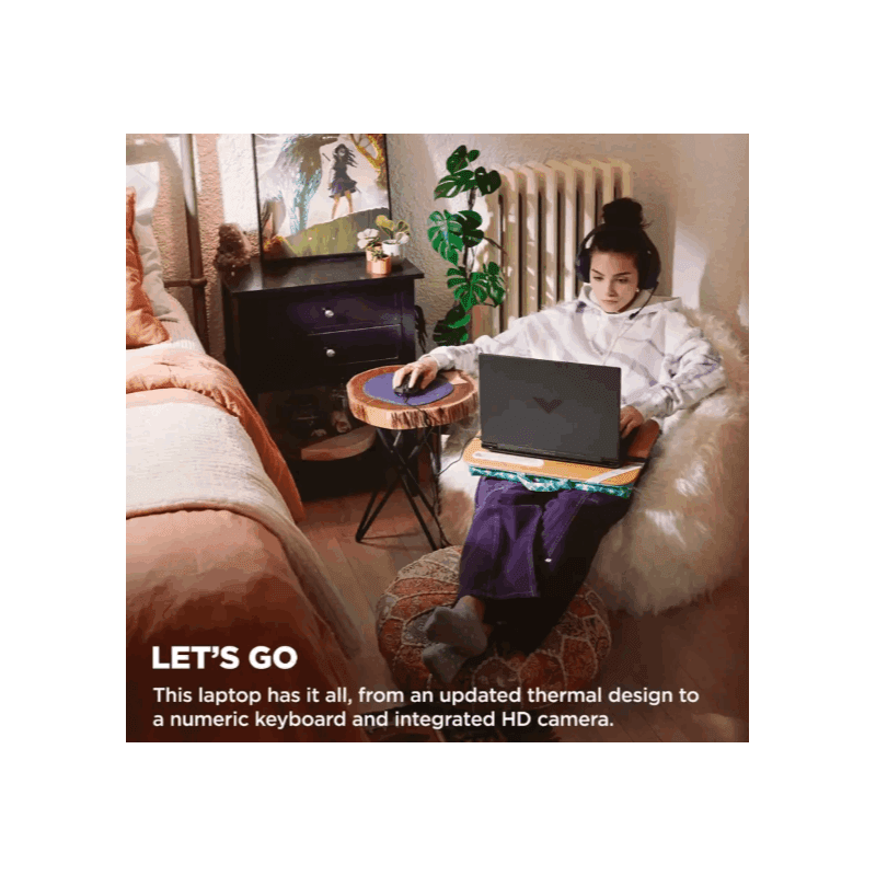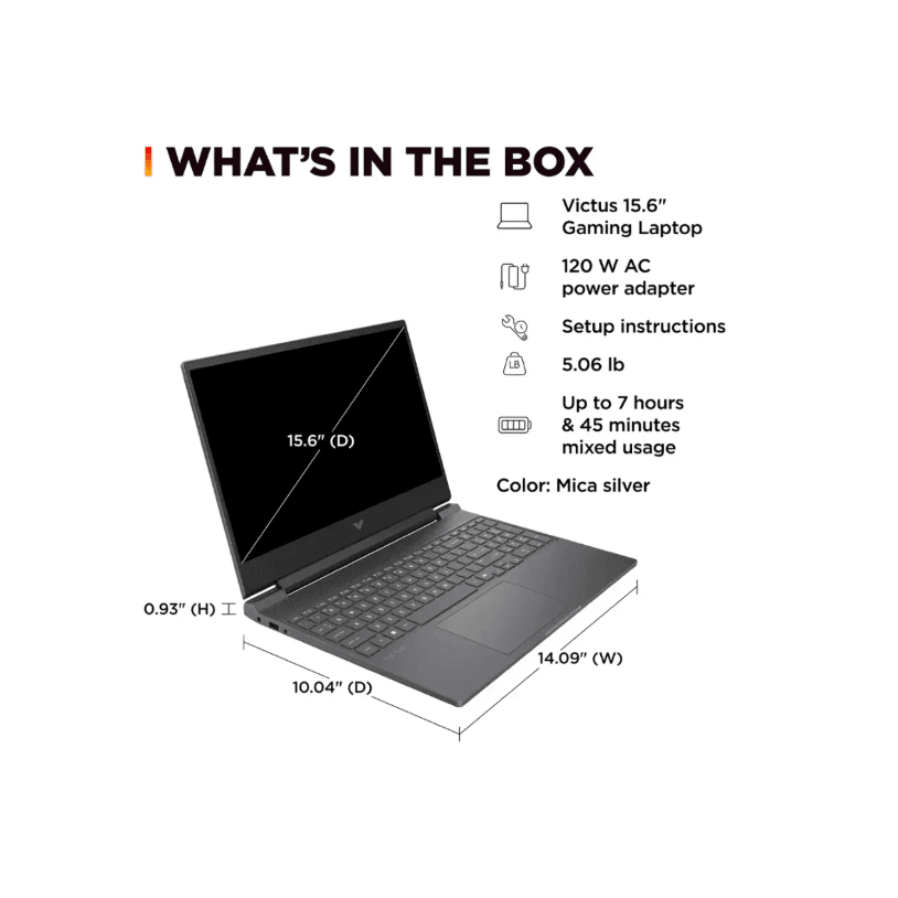 The HP Victus 15 FB3093 is a powerful gaming laptop featuring a 15.6″ FHD display at 144 Hz, paired with an AMD Ryzen 7 7445HS processor, NVIDIA RTX 4050 graphics, 16 GB DDR5 RAM, and a 512 GB SSD — all in a sleek Mica Silver chassis with a backlit keyboard.