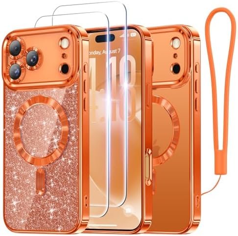Meifigno Designed for iPhone 17 Pro Max Case 6.9″, [Glitter Card & Wrist Strap] [Compatible with MagSafe] [2X HD Screen Protectors] Surround Raised Lens Protection for 17 ProMax Case, Cosmic Orange : Cell Phones & Accessories